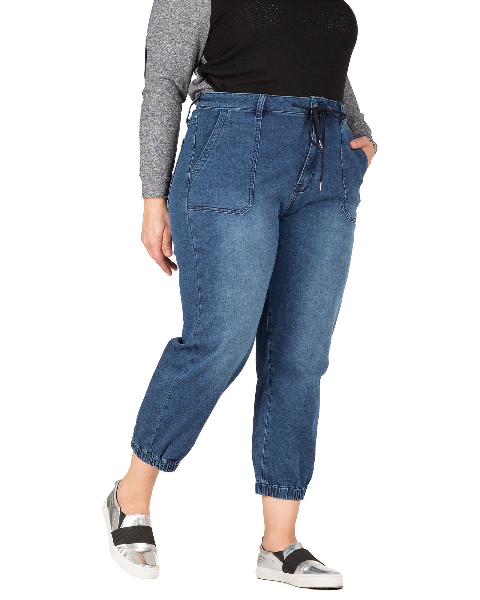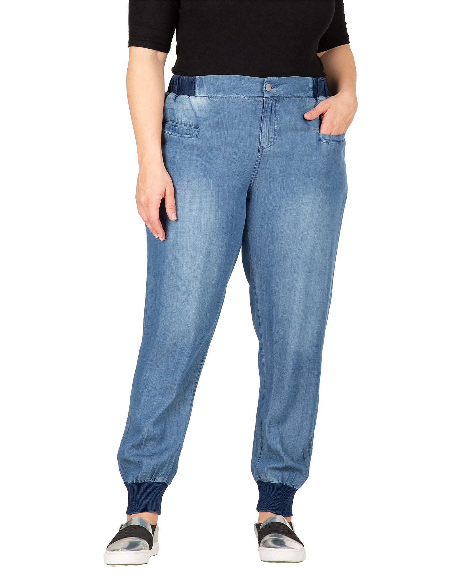 Plus size women’s joggers are very on trend and have been for a few years now. What is a jogger? They started out as activewear and were used for exercising. It’s a pant, usually made in knit or sweatshirt material, that have either a ribbed, elasticated, or drawstring waistband, at least two pockets and a ribbed hem. They come in every fabric you can think of, even faux denim. You can pair joggers with tees, tunics, crop tops, and, of course, activewear separates and hoodies.