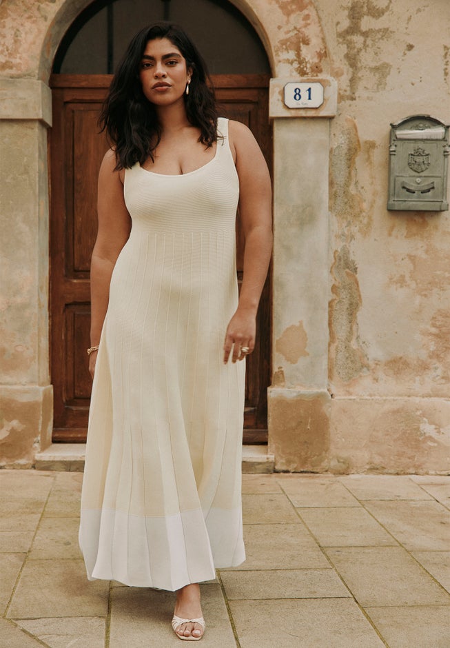 Step into refined comfort with this knit midi dress accented by a contrast hem. A fitted bodice and pleated skirt create effortless, modern elegance.