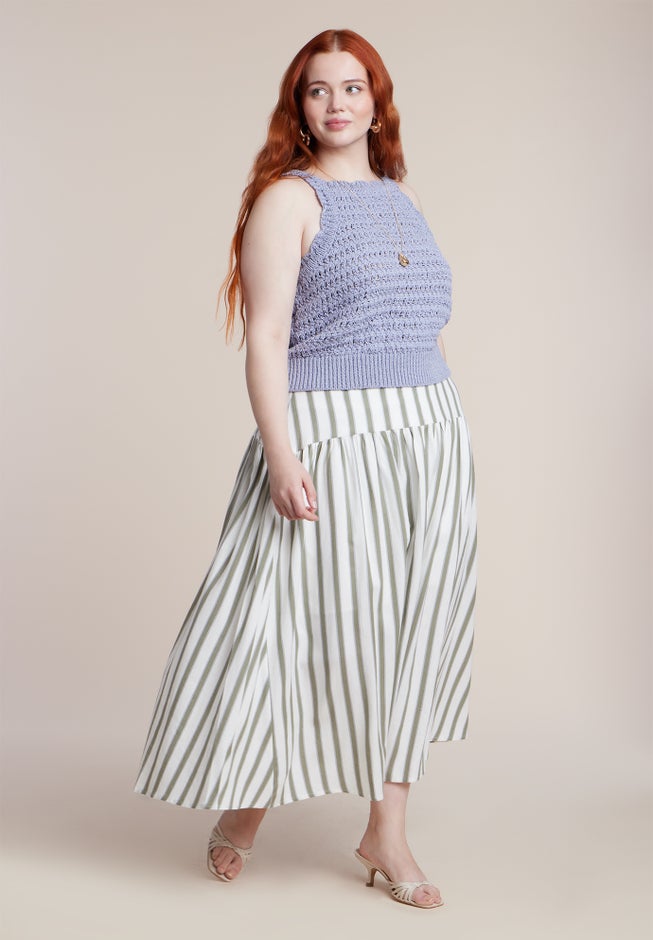 Refine warm-weather dressing with this striped linen-blend, drop-waist midi skirt designed for easy movement. A softly defined waist and fluid midi length create relaxed, modern polish.