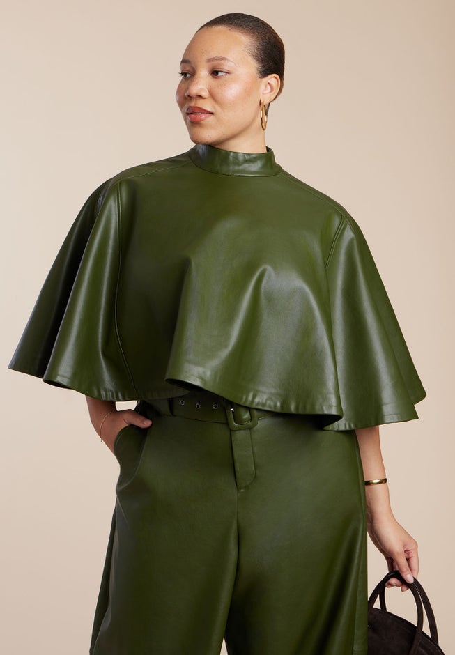 Make a striking statement in this faux leather cape top with a dramatic drape. A mock neckline and cropped length bring modern sophistication to any after-hours look.