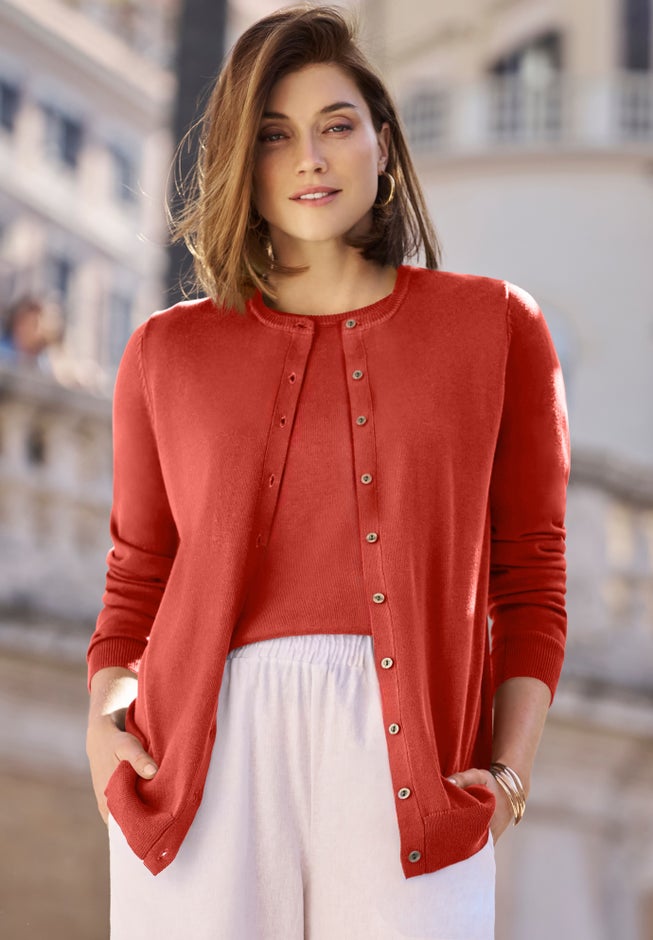 This classic women's plus size button-front cardigan features a clean, streamlined silhouette that layers easily over tees, sweater shells and button-downs. Crafted from a smooth fine-gauge knit that feels soft against the skin and maintains its shape wear after wear, it provides comfortable coverage and easy styling for plus-size wardrobes.