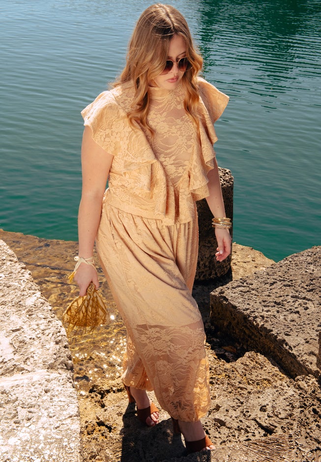 This floral lace ruffle top features a sheer high neckline panel, delicately framed by cascading ruffles that fall from the shoulders. The fitted waist softly shapes the silhouette while intricate lace adds depth and romantic texture. Feminine and quietly dramatic, it evokes the feeling of a cherished vintage find. Women's plus-size top.