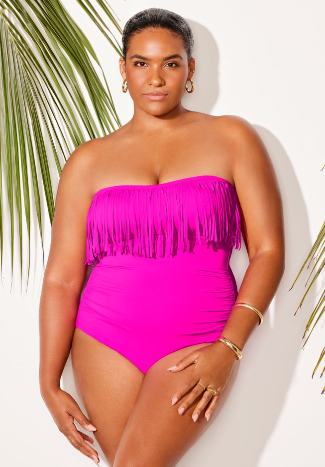 Talk about a swimsuit with fringe benefits. This fringe accented bandeau one piece can rock two looks in one. With straps it’s a halter, strapless it’s a bandeau. It has sewn-in cups for extra bust support, a tummy smoothing Power Mesh lining and side-shirring to up the style factor.