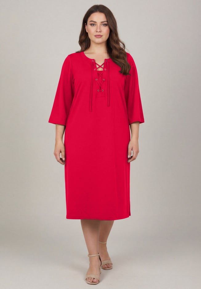 Chic and modern, this knit crepe sheath dress features a lace-up neckline with metal grommet details for an elevated touch. The streamlined silhouette is complemented by three-quarter bell sleeves, side seam pockets, and side slits for ease of movement. Designed in a comfortable stretch fabric, it’s a polished look that transitions effortlessly from day to night.