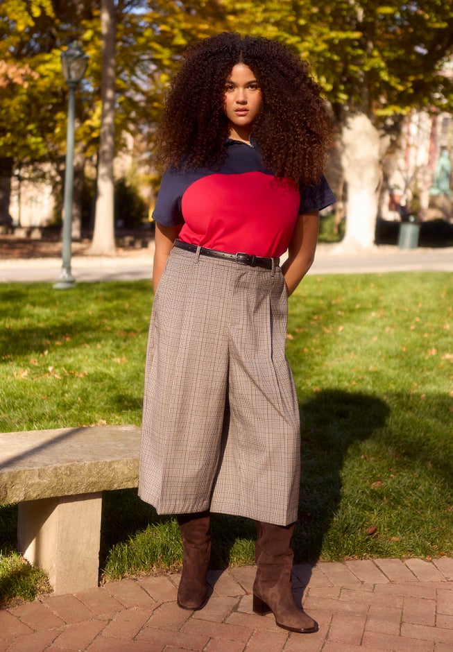 Add a fashion-forward twist to tailoring with these plaid culotte trousers. A cropped wide leg and crisp pleats create a bold yet balanced look.