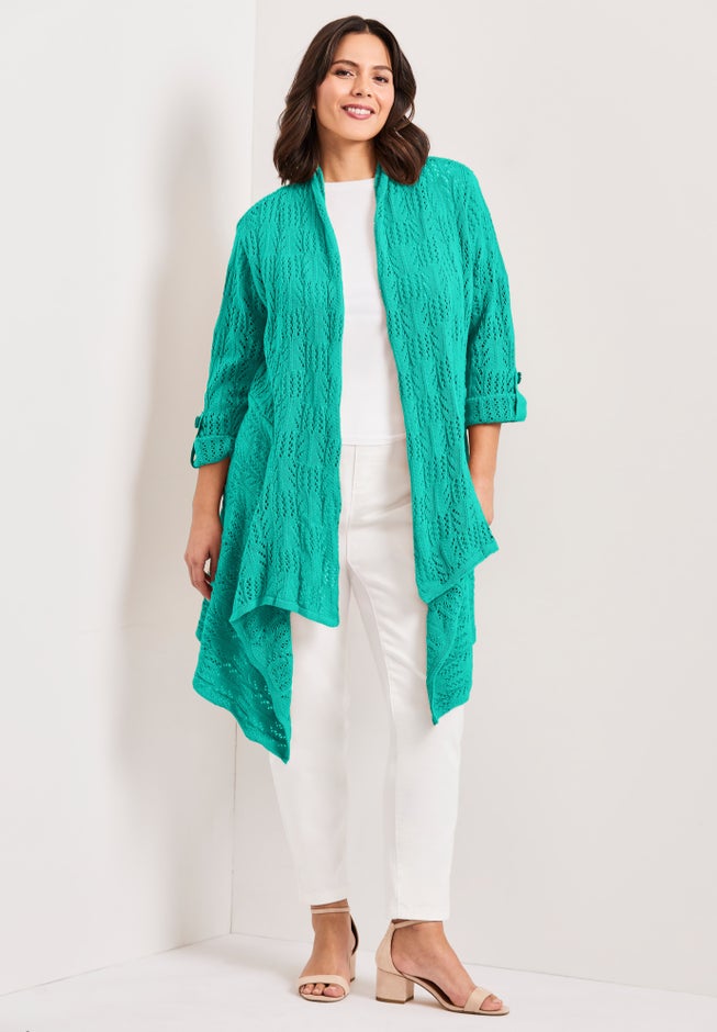 This lightweight cardigan features an open-front design with a cascading draped hem for effortless movement. The three-quarter sleeves have adjustable tabs, allowing for versatile styling and comfort.