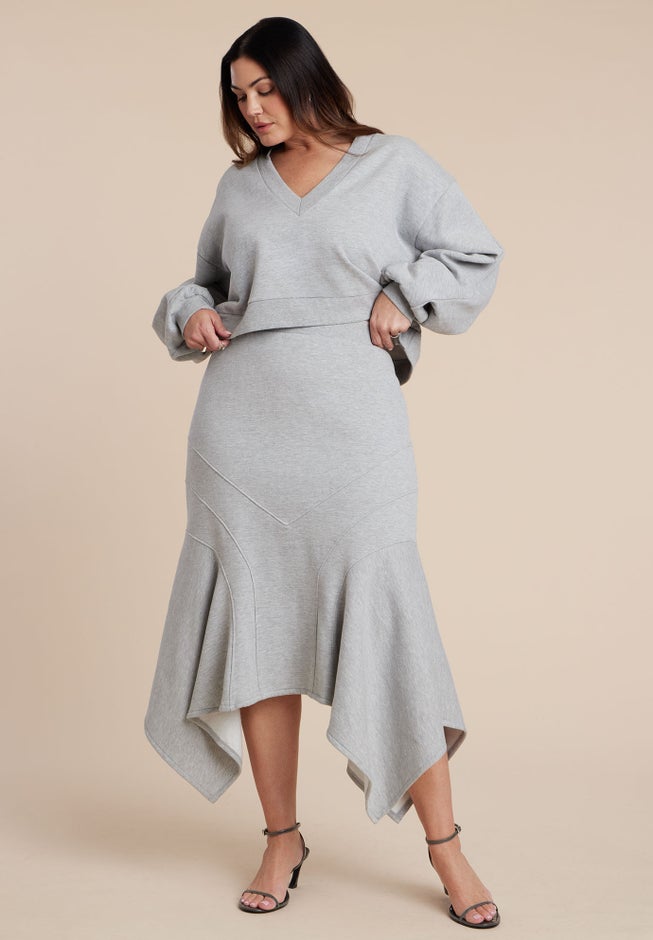 Infuse relaxed drama to everyday dressing with this French terry midi skirt shaped by a sculptural trumpet hem. Seam detailing and soft stretch create fluid movement and endless comfort.