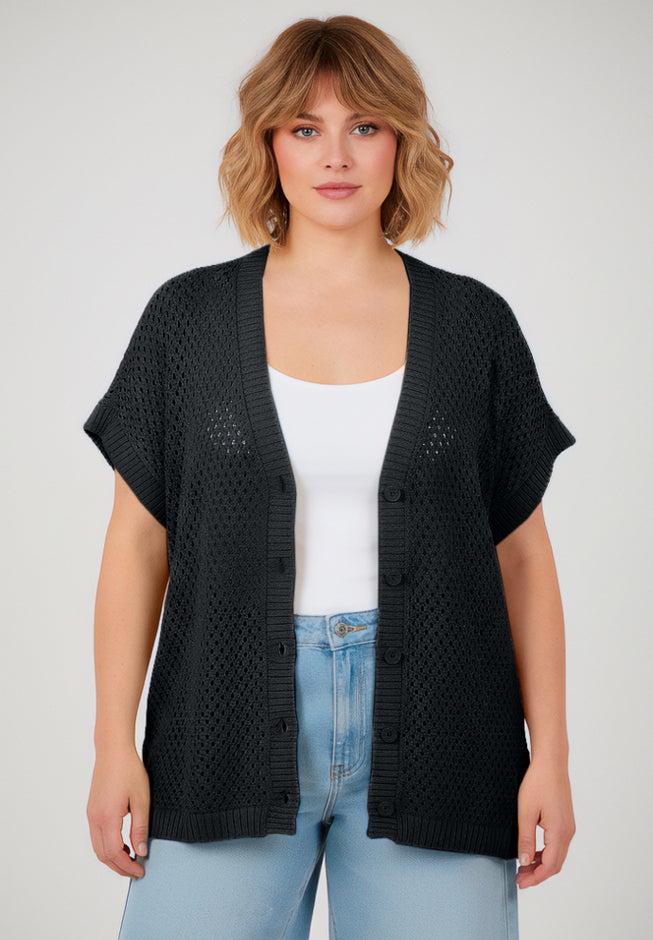 This lightweight netting cardigan features a breathable open-knit texture with a classic button-front design for easy layering. Designed with relaxed dolman sleeves, rib trim details, and side vents, it offers a comfortable fit with effortless movement. An ideal warm-weather layer, it adds subtle texture and polish to tanks, tees, and dresses alike.