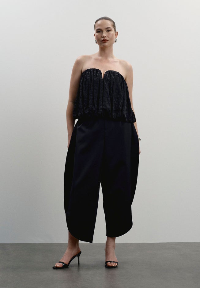 - Cropped, strapless balloon silhouette