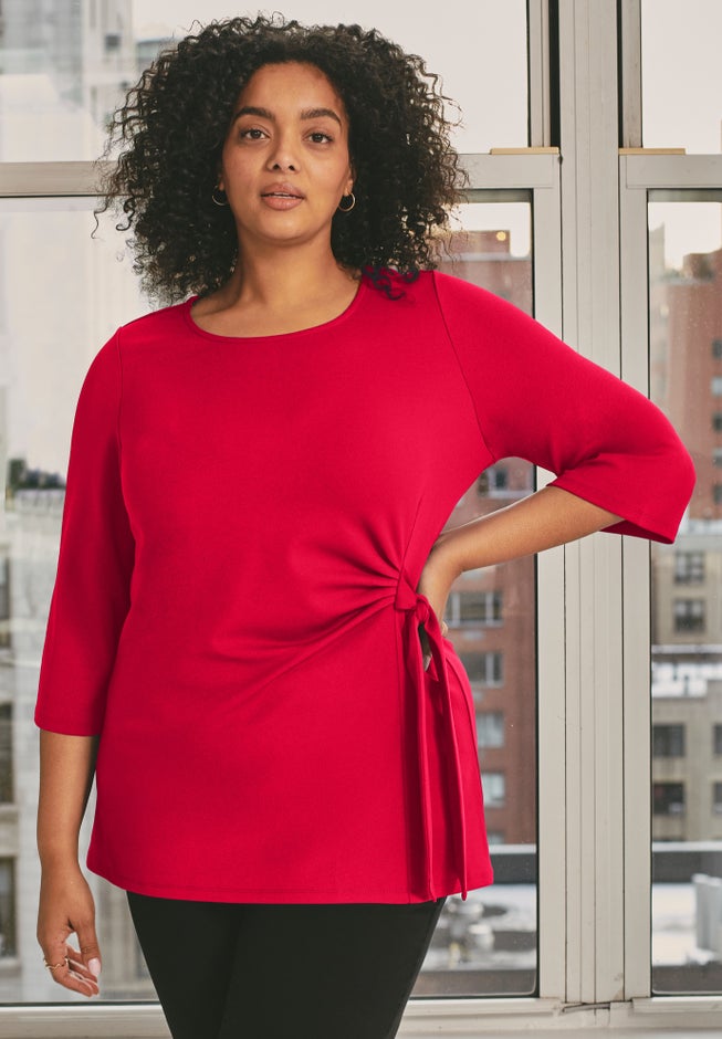 This easy knit crepe tunic features a clean neckline with a flattering side tie that lets you customize the fit at the waist. Designed with flowy 3/4 bell sleeves and a relaxed silhouette, it offers comfortable movement with a polished feel. A versatile pull-on style, it pairs effortlessly with everything from work-ready pants to casual denim.