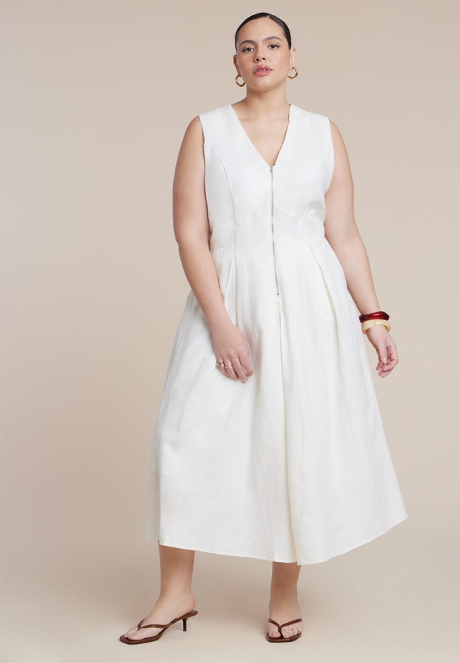 Refresh your warm-weather rotation with this zipper-detail, linen-blend maxi dress designed with tailored seaming. A defined waist and fluid skirt bring composed structure.