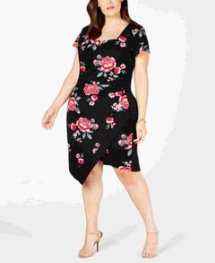 A chic purple dress with floral embellishments, featuring a round neckline and 3/4 length sleeves.